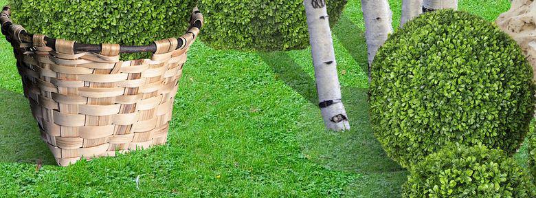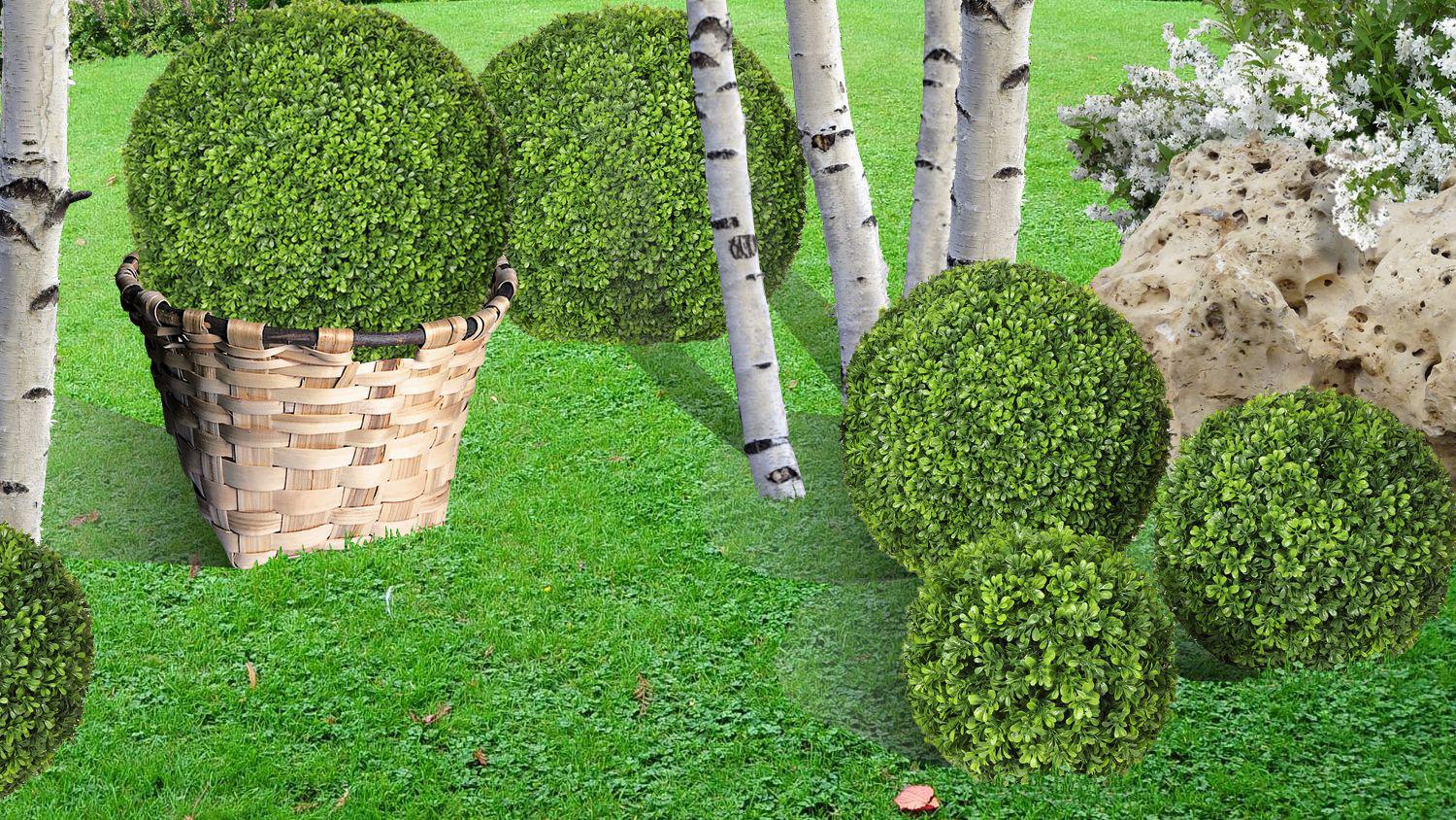 Le vert très soutenu du buis est mis en contraste sur ce modèle avec les troncs d'une cépée de bouleaux blancs.
