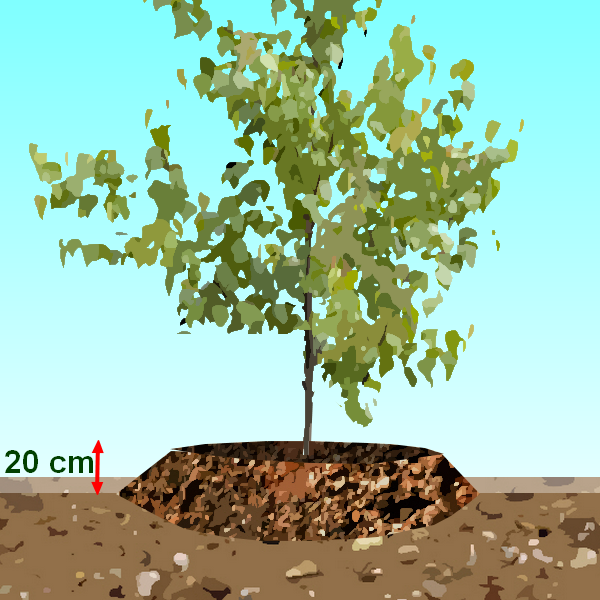 Aménagez une butte haute de 20 cm à 25 cm et trois fois plus large que la motte de l’arbre ou l’arbuste à installer.