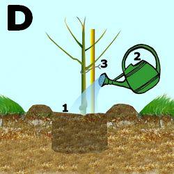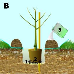 Vous pouvez mélanger à la terre un peu de compost bien mûr et de corne torréfiée (image B3). N’apportez jamais des engrais chimiques en grande quantité. Ils bruleraient les racines. En règle générale il ne faut pas trop faire d’apport à la plantation (sauf pour les plantes de terre de bruyère), il vaut mieux laisser l’arbuste s’acclimater à votre sol. Si l’arbuste est volumineux, placez un tuteur (image A2).