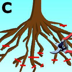 Habillez les racines (image c) des arbustes à racines nues, c’est-à-dire couper les racines abimées, blessées, et raccourcir légèrement les autres pour les forcer à émettre de nouvelles radicelles. Attention, faites des coupes en biais, de sorte que la surface de coupe se trouve face à la terre et non l’inverse. Coupez les branches abimées et diminuer un peu les autres pour les rééquilibrer par rapport aux racines.