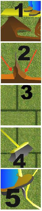 (Gardez-en un peu pour les joints de plaques) Surtout, ne faites pas de marques de pas profondes, car à cet endroit lors de la mise en place une partie des plaques de gazon ne ferait pas corps avec le sol. Une astuce pour remédier à cela. (je l’ai moi-même pratiqué pour de petites surfaces) Mettez aux pieds des planches de carreleur sanglées.