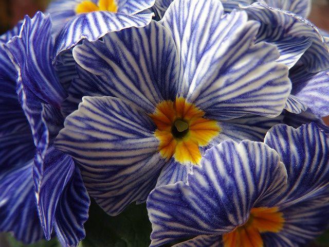 La primula acaulis F1 'Zebra Blue' à une floraison bleue zébrée de blanc.