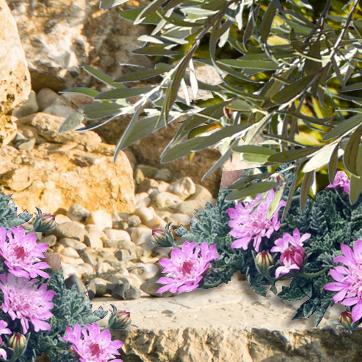 Originaire du Maroc (montagnes de l’Atlas), c’est un excellent couvre-sol. Il étale un dense tapis de feuilles persistantes gris vert. Il fleurit de la fin du printemps et en été avec de grandes fleurs mauve-rose. C’est une formidable plante pour les allées dallées fleuries.
