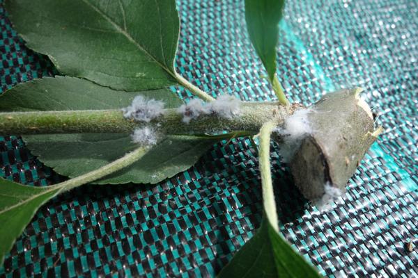 Le puceron lanigère se nourrit de sève, qu’il prélève sur les parties ligneuses et les jeunes pousses.