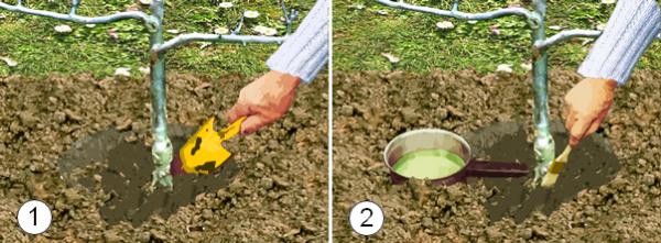 En février ou début mars, faites une infusion de tanaisie (200 g de plante sèche dans 1 d’eau de pluie et faites chauffer jusqu’au frémissement de l’eau. Laissez refroidir et laissez infuser une nuit. Le lendemain, ajoutez du savon noir. À l’aide d’un petit « piardon » ou un transplantoir, dégagez délicatement le collet du pommier(1). Badigeonnez le collet et le départ des racines avec ce mélange(2). Cette méthode est applicable aux jeunes pommiers ou poiriers.