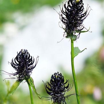 Phyteuma spicatum, commun dans beaucoup de régions de France, de Suisse et de Belgique et dans toute l’Europe, est connu sous le nom de « raiponce sauvage ». Haut d’environ 50 cm, il porte des feuilles inférieures larges à limbe échancré, et des feuilles supérieures entières et allongées. Les fleurs, souvent bleu foncé apparaissent en épi cylindrique.