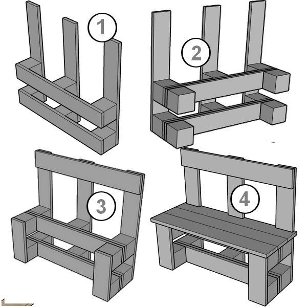 Voici un modèle de banc de jardin réalisé avec quelques palettes de récupération qui pourra composer avec la table vue précédemment un salon de jardin.