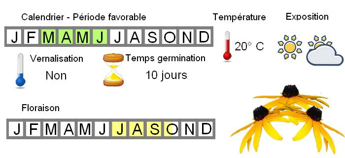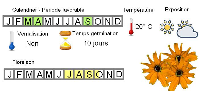 Originaire d’Amérique du Nord, c’est une Plante haute de 30 à 60 cm, très ramifiée. Les Fleurs à deux ou trois rangs de ligules jaune d’or avec un capitule brun s’épanouissent abondamment de juillet à octobre. Il existe des cultivars et hybrides avec des coloris chauds et variés.