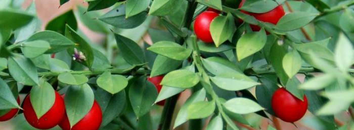 Petit arbuste habitué de nos bois portant des baies rouges en hiver, le ruscus porte justement le nom vernaculaire de « fragon petit houx ». Il est possible de le cultiver au jardin.