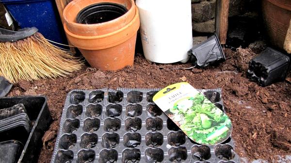 Déposez une graine dans chaque alvéole et enfouissez-la superficiellement et arrosez en pluie fine.