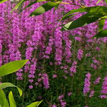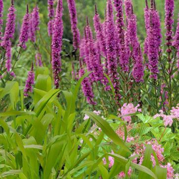 Une autre superbe variété : la salicaire « Dropmore purple » : une touffe de 60 cm de hauteur produisant en été une spectaculaire floraison pourpre rosée.