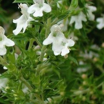 - Satureia montana : la sarriette vivace ou des montagnes est un petit buisson de 30 ou 40 cm de haut, à tiges ligneuses très ramifiées. Elle porte de petites feuilles coriaces, étroites, vert argent, et des fleurs blanches ou lilas pâle.