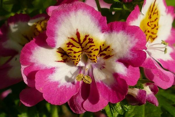 Schizanthus X wisetonensis : le plus cultivé des schizanthus, est un hybride entre S. pinnatus et S. grahamii. Cette plante touffue de 30 cm de hauteur, à port pyramidal, fournit une extraordinaire floraison faite de fleurs de 6 à 7 cm allant du rose saumon au rouge carmin, unies ou panachées de pourpre.