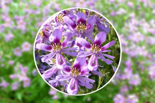 Schizanthus pinnatus : c’est une plante de 50 cm environ, avec de longues feuilles découpées. Les belles fleurs sont bleues.