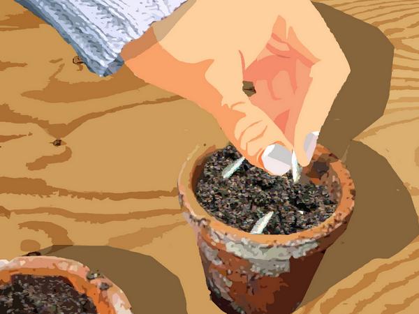 Déposez les graines couchées, sur la tranche, puis recouvrez-les de terreau. Arrosez sans excès.