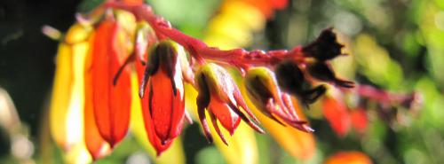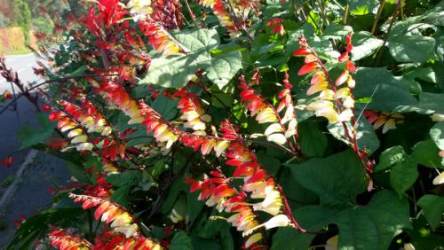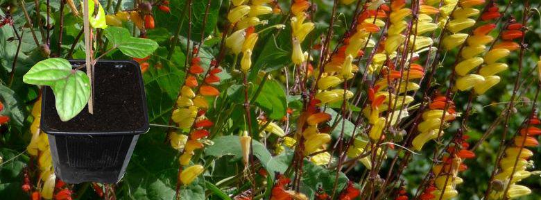 Au début de la floraison, les fleurs de la mina lobata sont rouges pour devenir spectaculairement jaune orangé.