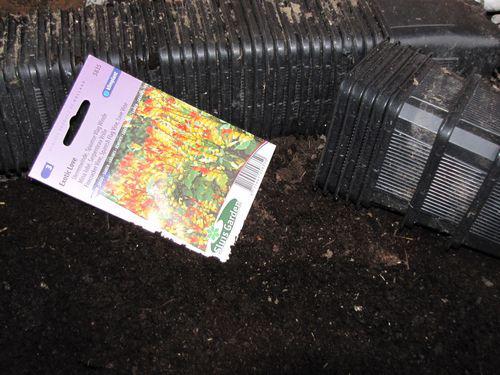 Dans des godets de 7 cm remplis d’un bon terreau de type semis (sans engrais), placez un petit tuteur et semez une ou deux graines à 1 cm de profondeur.