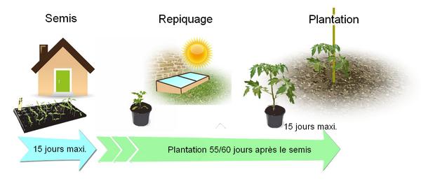 Tout dépend aussi de la précocité des variétés. Le temps entre le semis et la plantation d’une tomate est de 6 à 8 semaines, selon les conditions de température et de luminosité.