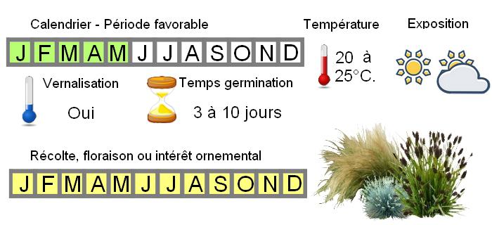 Les graines se récoltent en été et en automne en enveloppant l’épi dans un sachet de papier kraft quand il est à maturité. Les épis récoltés y seront conservés dans un endroit sec et aéré.
