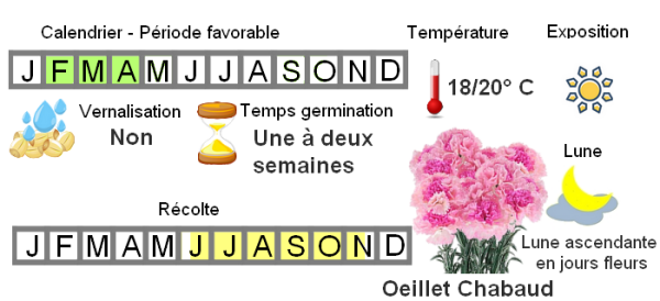 L’œillet Chabaud (Dianthus caryophyllus) est un œillet annuel florifère aux fleurs divinement parfumées. Les fleurs sont portées par de solides tiges de 50 à 70 cm et droite ce qui en fait au jardin une valeur sûre pour la production de fleurs à couper.