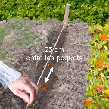Travaillez la terre en profondeur, amendez-la de compost et nivelez le lit de semence. Tracez des sillons de 5 cm de profondeur le long d’une clôture grillagée par exemple et semez-les là aussi en poquet de trois graines ou en ligne en plaçant une graine tous les 10 cm. Recouvrez les graines et tassez la terre.