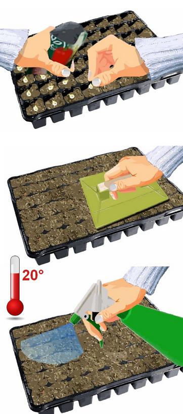 Remplissez les alvéoles de bon terreau et déposez une graine par motte. Recouvrez de terreau et tassez et humidifiez avec un petit pulvérisateur ou un arrosoir de serre avec une pomme fine.