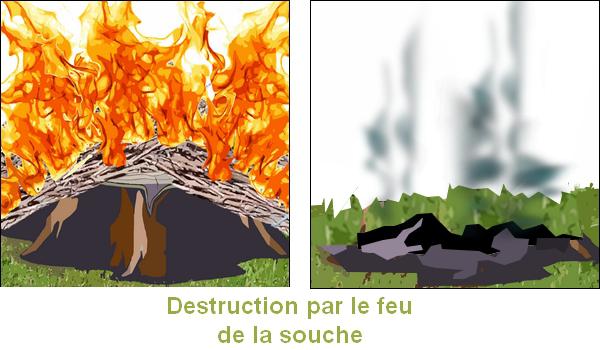 Souvent employé à la campagne, cette méthode ne peut s’appliquer que pour de très grands jardins ou aucun risque d’incendie n’est possible. C’est pour cela qu’il vaut mieux éviter d’intervenir en période de sécheresse. Il faut préparer la souche comme précédemment et faire un brulot de branchage sur la souche. Plusieurs brulots sont nécessaires selon le diamètre.