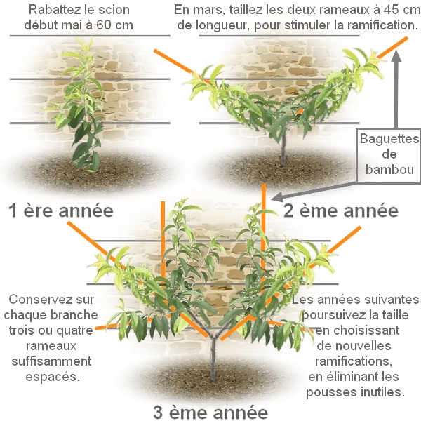 - La première année : Taillez le scion à 60 cm du sol début mai, en taillant juste au-dessus d’un œil. Durant l’été, choisissez deux pousses vigoureuses situées de part et d’autre du tronc, poussant parallèlement au mur à 30 cm du sol environ. Palissez ces deux pousses sur le premier rang de fil de fer et pincez toutes les autres. Attacher ensuite des baguettes de bambou à 45° aux fils de fer pour le palissage des rameaux du pêcher choisis et les maintenir à la forme voulue.