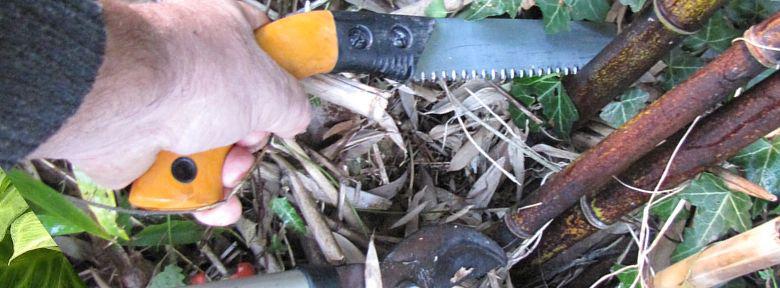 Faites une première taille en supprimant les chaumes morts et les chaumes penchés ou tordus. Faites des coupes avec un gros sécateur ou mieux avec une petite scie.