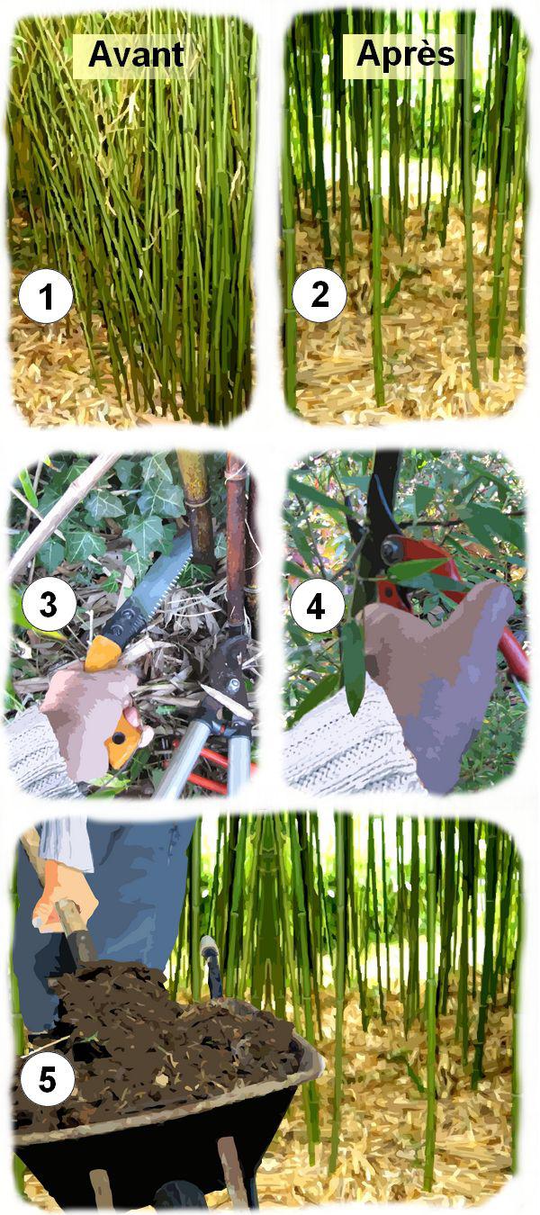 Cette taille ne s’adresse qu’aux grands bambous en massif. Très rapidement les bambous forment une masse compacte de chaumes qui partent en tous sens.