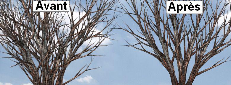 Le travail se fait dans la durée. Il faut s’y reprendre à plusieurs fois pour la taille d’un sujet. Après une première coupe où l’on supprime quelques rameaux secondaires et les bois morts, on prend du recul. C’est après ce premier examen que l’on peut commencer à tailler des rameaux du plus gros diamètre. Là aussi, faites-le en plusieurs étapes, car l’effet que vous allez produire par votre taille est irréversible ! Maintenant en transparence, clocher et collines apparaissent.