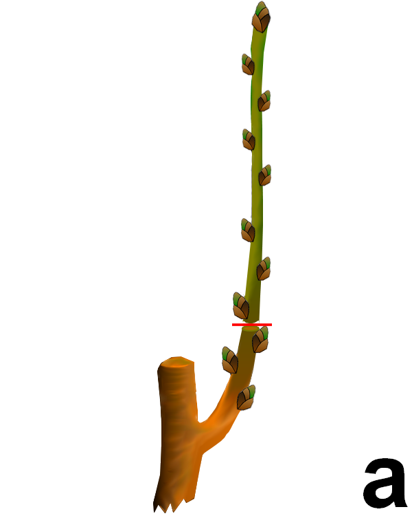 Conservez les deux dards et coupez le rameau à trois yeux.