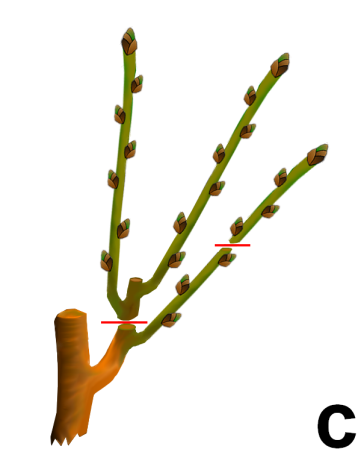 Sur les deux rameaux, on en conserve un (le plus à l’extérieur) taillé à trois yeux.
