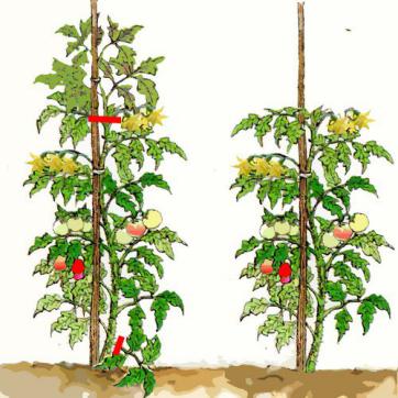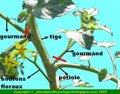 Attention ! celles qui apparaissent entre deux feuilles, et non à leur base, sont des boutons floraux : les futures tomates, ne les coupez pas.