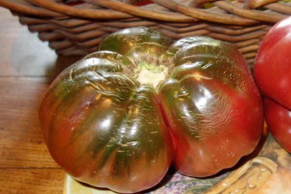 Cette tomate prend une couleur rouge brun avec, vers le pédoncule, du vert très foncé presque noir à maturité.