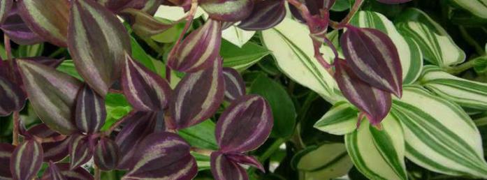 Tradescantia Zebrina pendula : a des feuilles atteignant 7,5 cm de long ; elles sont vert moyen, longitudinalement rayées d’argent, pourpres en dessous.