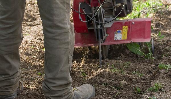 Après une culture d’engrais vert semée en automne et après broyage de celui-ci la terre est vivement et très superficiellement retournée à la motobobineuse.
