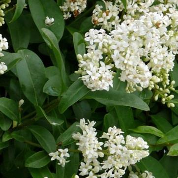 C’est un troène à feuillage foncé et caduc, porte en été de longues grappes de fleurs blanches.
