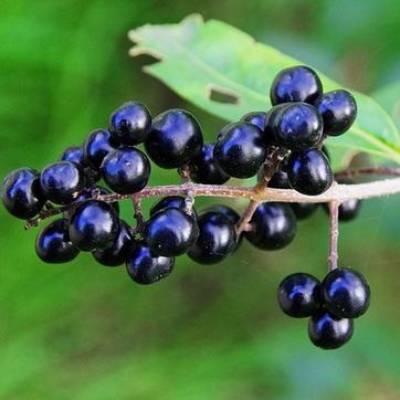 Les fleurs blanches, très odorantes, s’épanouissent à la fin du printemps en grappes terminales denses. Elles produisent des baies noir violacé, à jus rougeâtre, appellées « raisin de chien » qui restent longtemps sur l’arbuste. En automne, les feuilles prennent une jolie teinte rouge ; elles tombent tardivement.