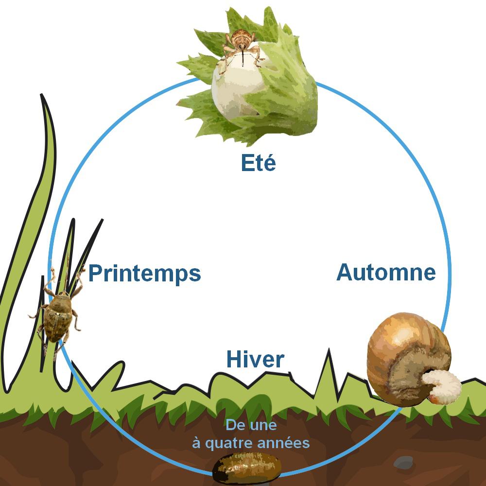 Le cycle de l’insecte peut s’étendre sur 1 à 4 ans. Il faut donc être vigilant plusieurs années de suite après une attaque.