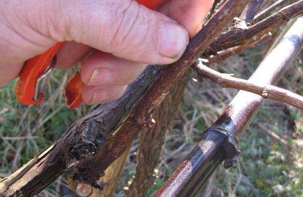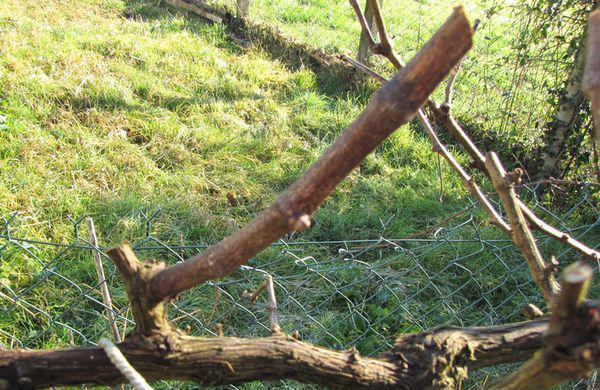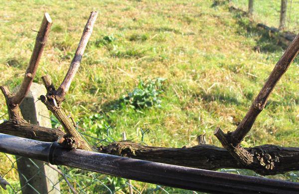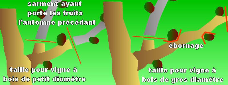 Elle se pratique de mi-février à mars selon les régions et le climat et les variétés. Taillez les sarments au-dessus du deuxième bourgeon pour les variétés portant des rameaux de petits diamètres. Selon les espèces et la vigueur de leur végétation, vous pouvez tailler jusqu’au-dessus du quatrième bourgeon. Supprimez le rameau ayant porté les grappes de raisin l’année précédente ; il est coupé à la base (voir dessins). Quand vous taillez les sarments à quatre bourgeons, gardez-en un à la base (il fera le rameau de remplacement pour l’année suivante). Supprimez les deux bourgeons intermédiaires.