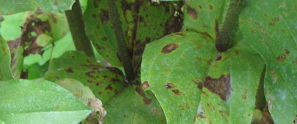 C'est la maladie la plus souvent rencontrée sur Zinnias. Des taches brunes se forment sur les feuilles (voir image) Les feuilles sèchent.